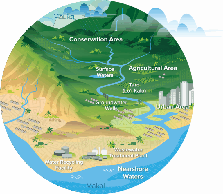 For an island community, water is at the center of our way of life. Like ahupua’a, One Water connects communities and natural resources from mauka to makai (mountain to ocean) to protect nature and collaboratively implement actions to address risk and promote healing and sustainability.