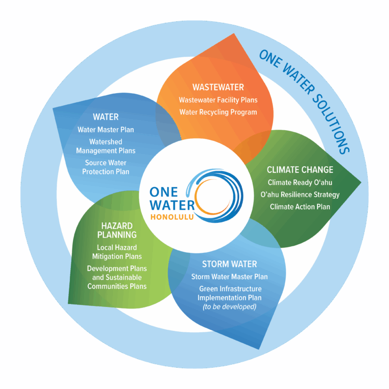 By the end of 2026, the One Water Honolulu Plan will support implementation of the City and County of Honolulu’s Climate Ready O’ahu strategy, to prepare and safeguard people, ʻāina, and infrastructure, by providing a holistic water management plan and a 30-year Capital Improvement Program of multi-benefit projects to build resilience in our island’s infrastructure and natural systems.